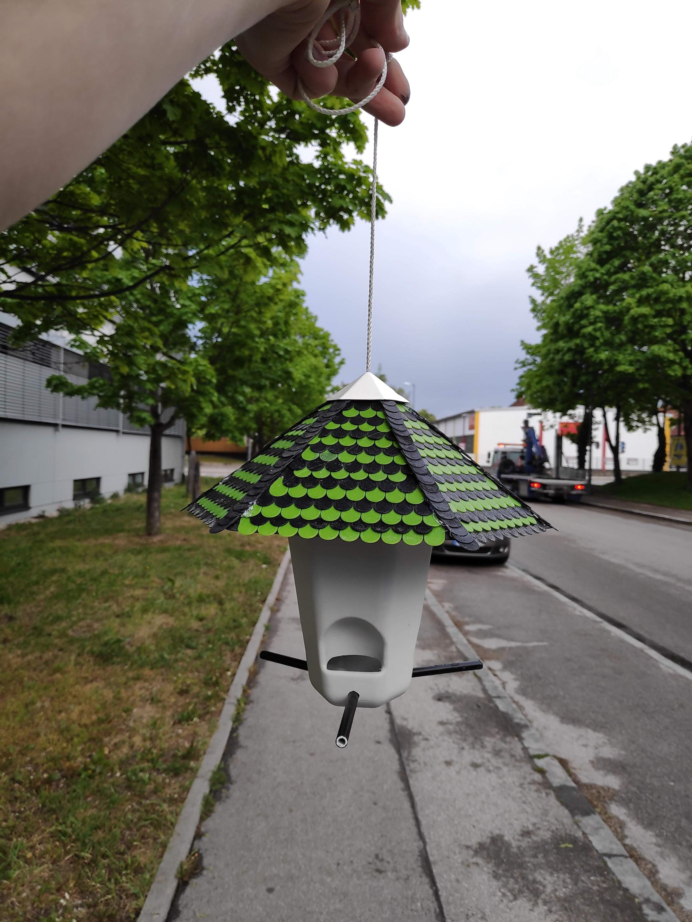 Transform your outdoor space into a bustling bird sanctuary with this uniquely designed 3D-printed bird feeder. The striking scale pattern in green and gray adds a decorative touch while serving a practical purpose. The thoughtful design features a protective overhang to help keep seeds dry and accessible. Crafted with durability in mind, this feeder withstands outdoor conditions while providing wild birds with a reliable feeding station. The distinctive pattern and neutral colors blend seamlessly with outdoor décor, making it an attractive addition to any exterior wall. Perfect for bird enthusiasts and nature lovers, this feeder helps attract various local bird species to your home. The convenient wall-mount design keeps the feeding area elevated and safe from ground predators, while offering excellent visibility for bird watching. Whether placed near a window or in your garden, this feeder creates an engaging wildlife experience right at your doorstep.