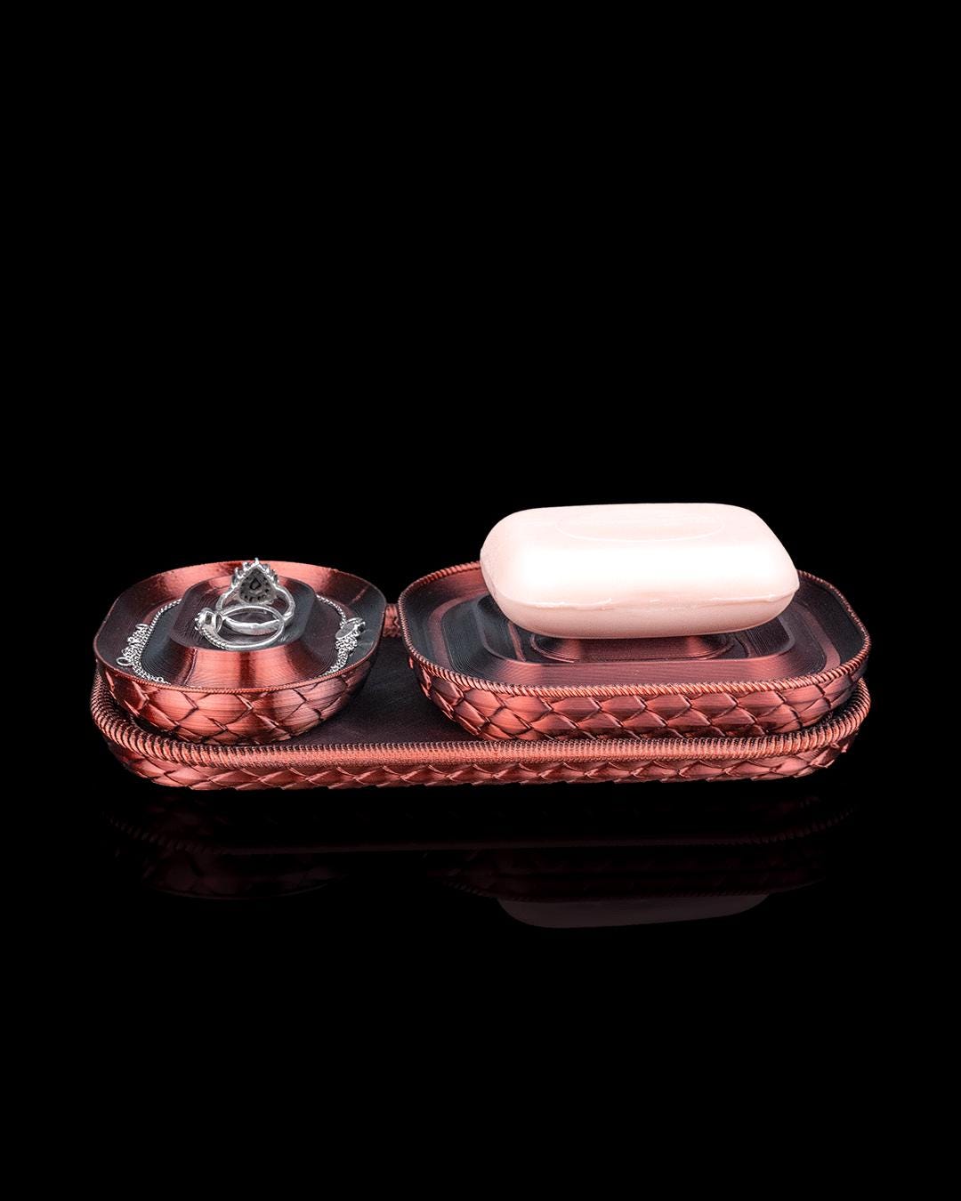 Bring a touch of elegance and functionality to your bathroom, vanity, or office with this stunning black and copper organizer set. Inspired by dragon scales and crafted with precision, this multi-functional kit helps you keep everything tidy — from makeup and toiletries to cotton swabs and tissues. 🧰 What’s included: 1x Tissue Box with Lid 1x Organizer Tray with Compartments 1x Cotton Swab Holder with Lid 1x Soap Dish with Lid 1x Lidded Box for Makeup or Jewelry 1x Tall Container with Lid 1x Rectangular Storage Tray ✨ Features: Unique scaly texture with a stunning dual-tone copper & black finish Versatile for bathroom, makeup station, or even desktop organization 3D printed in eco-friendly PETG – strong and lightweight Easy to clean and long-lasting Modular design – use pieces individually or as a set 📏 Approximate Dimensions (inches): Tall container height: 8.6 in Tissue box: 6.2 x 4.3 x 3.5 in Cotton swab holder: 3.5 x 3.5 x 3.5 in Soap tray: 3.9 x 3.1 x 1.2 in Note: All sizes are approximate. Measurements refer to the outer edges. 🎁 Perfect for: Bathroom & vanity organization Gothic or fantasy-themed decor Handmade gift for fans of unique design 🛠️ Material: PETG (durable, eco-friendly, and water-resistant plastic) 📦 Packaging: Securely packed for safe delivery 📸 Colors: Black & Copper gradient (may slightly vary due to lighting and filament finish) 🚫 Props (toothbrushes, cosmetics, etc.) not included.