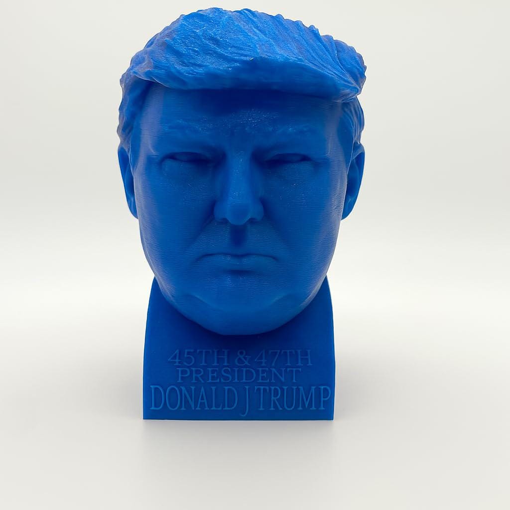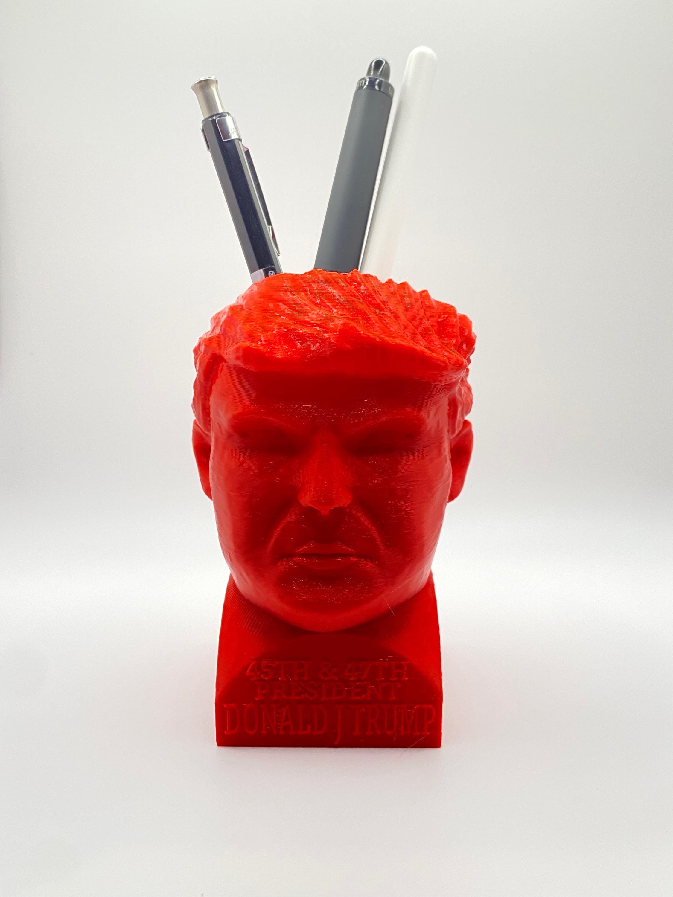 Add personality (and pens!) to your workspace with this 3D printed bust of Donald J. Trump, designed as a functional and bold desktop organizer. Pens fit neatly into the top of the head, making it both a conversation starter and practical office accessory. Perfect gift for collectors, political enthusiasts, or those with a sense of humor. ✨ Product Highlights: 3D printed in durable, eco-friendly PETG Sculpted bust with engraved “45th & 47th President Donald J Trump” Head doubles as pen/pencil holder Great for home offices, political gifts, or novelty décor Available in 5 color variations: Black, Blue, Brown/Wood, Red, White