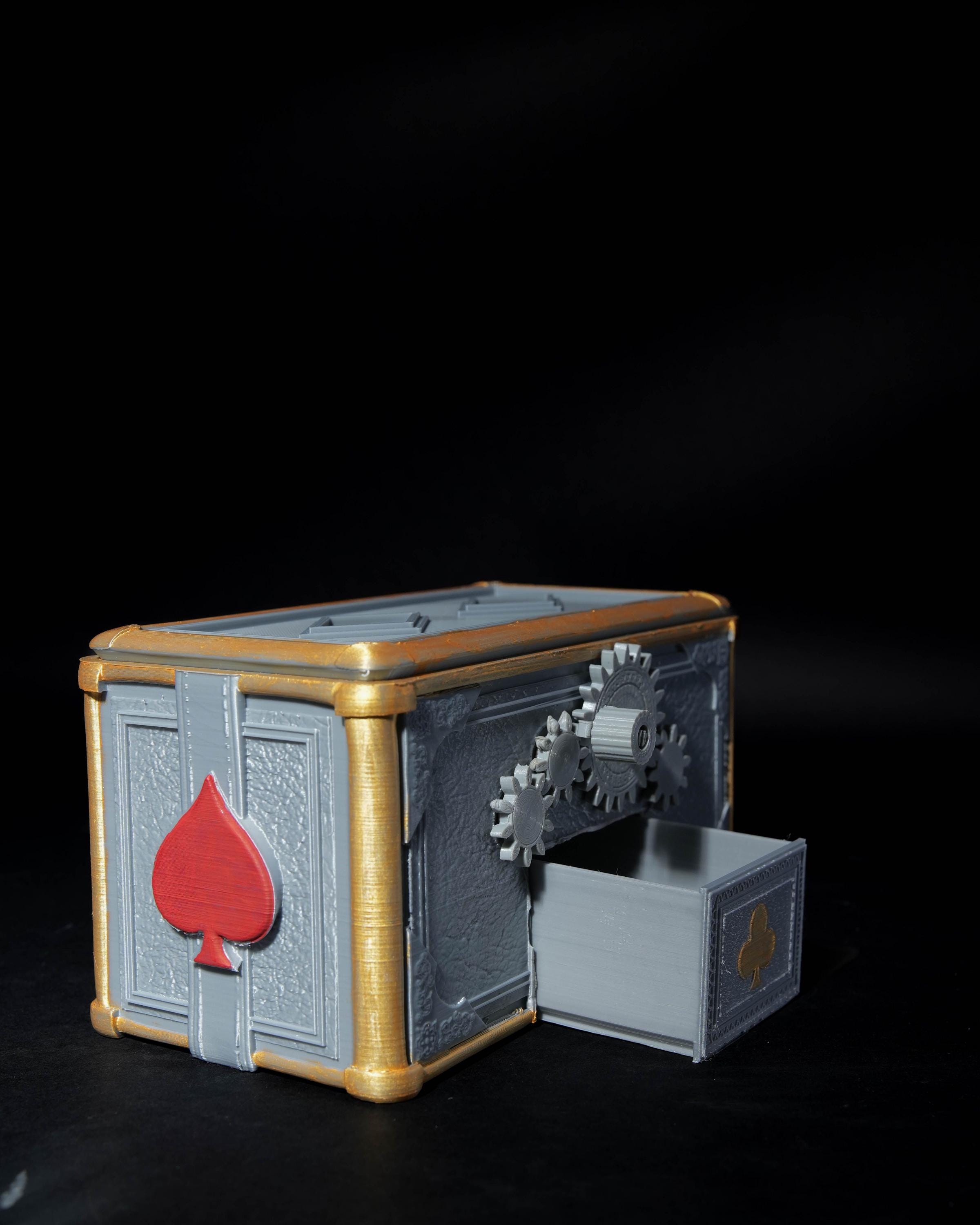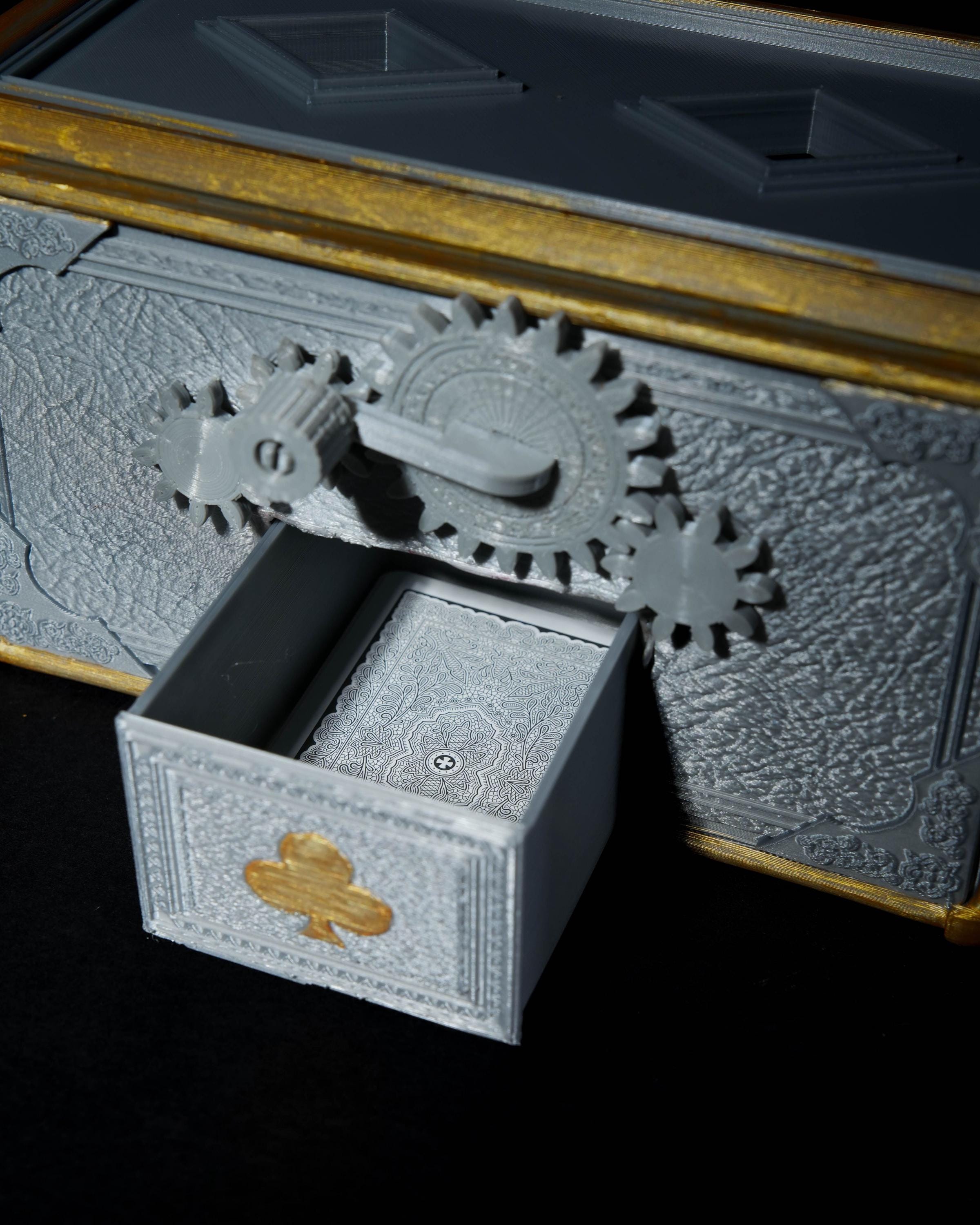 Bring elegance and mechanical charm to your game table with this 3D Printed Automaton Card Shuffler. Handmade in durable PETG, it features a functional gear system activated by a smooth hand crank, giving your cards a clean and satisfying mix. Designed for standard poker-size cards, this automaton blends function and style — a conversation piece for poker nights, magic practice, card collectors or lovers of mechanical curiosities. Each unit arrives fully assembled, tested and ready to use. Dimensions are approximately 7.5 in (L) x 4.5 in (W) x 3.5 in (H), making it compact and comfortable to operate with one hand. A standout accessory that adds flair, personality and craftsmanship to any card game setup. • Mechanical Hand-Crank Design Smooth, satisfying gear action powered by your hand. ⚙️🔄 • Fits Standard Poker Decks Perfect for 2.5 x 3.5 in playing cards. ♠️♦️ • Fully Assembled & Ready to Use Just place your cards and start mixing. 📦✨ • Durable PETG Construction Strong, precise layers for long-lasting performance. 🛡️ • Great for Poker Nights & Collectors A unique piece for card players, magicians and gear lovers. 🎩⭐ • Unique Automaton Aesthetic A standout display piece even when not in use. 👀📚 ⚠️ Not intended for children. This is a mechanical accessory made for adults.