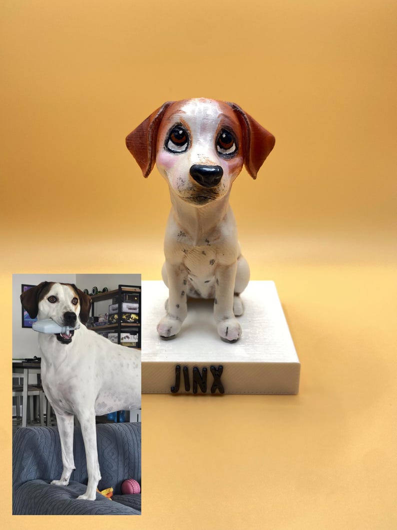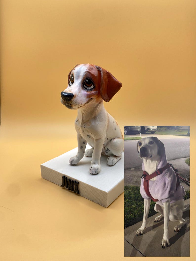 🎨 Artistic Custom Pet Sculpture Turn your beloved dog or cat into a unique, hand-painted 3D figure made in our whimsical artistic style. 📢 Note: This is an artistic interpretation, not a photorealistic replica. 🐾 Why You’ll Love It Handmade & 3D printed for durability Painted with care in our unique style Charming keepsake or heartfelt tribute Perfect as a gift for pet lovers 🎨 Personalized Your Way From “my best friend in a cute pose” to “my cat as an amazing vampire!” – we’ll bring your vision to life in our signature artistic style. 📦 Sizes & Prices Available as: Standard Sculpture Extra Large Sculpture Keychain Sizes may vary slightly as each piece is handmade. 📝 How It Works Place your order Send us clear photos of your pet Tell us your creative idea We create and hand-paint your sculpture Ships securely to your door ⚠️ Important This is an artistic interpretation, not a realistic copy Personalized items are non-refundable unless damaged ✨ Celebrate your pet with a keepsake made just for you — a heartfelt tribute to the bond you share.