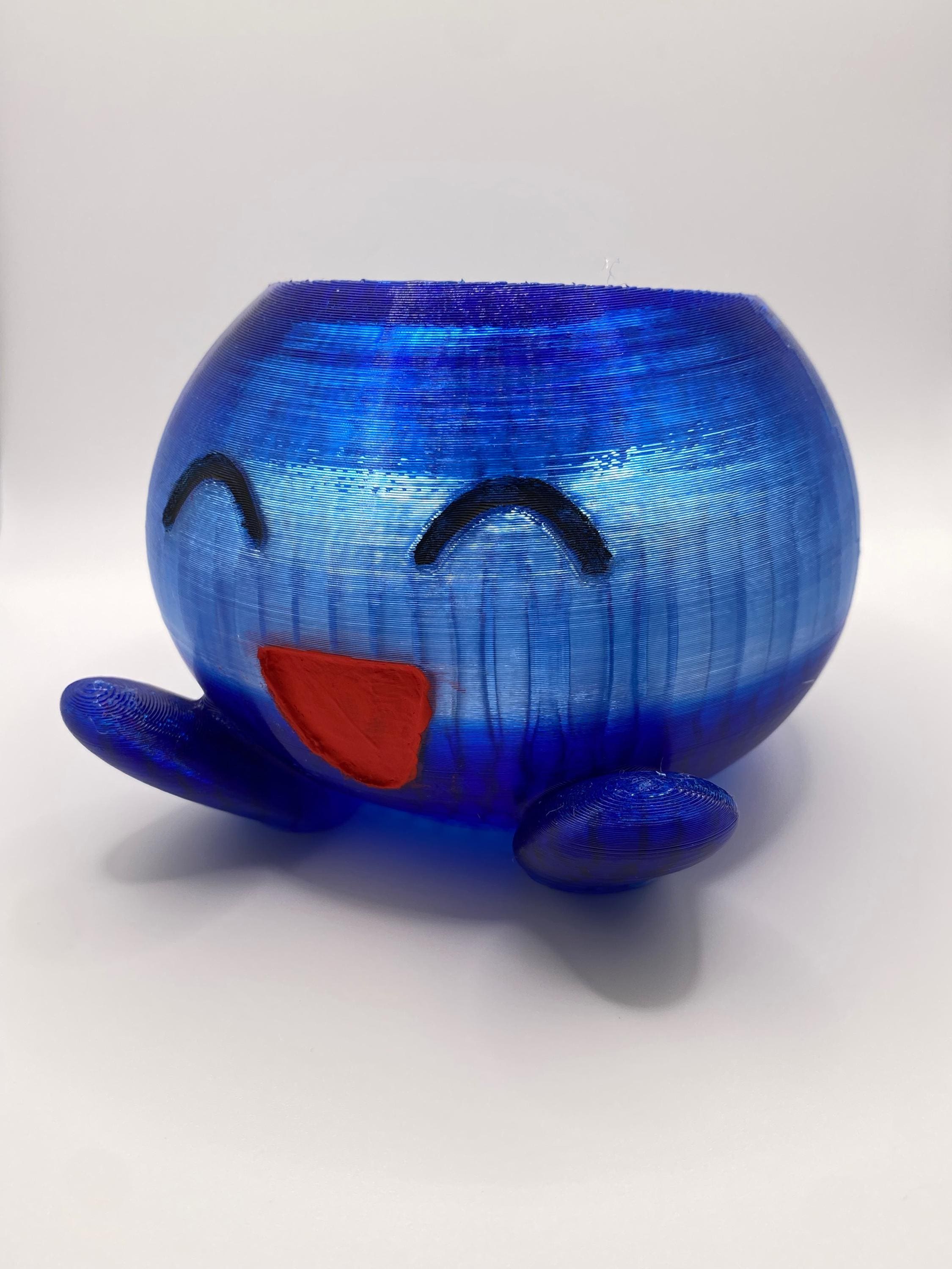 Add a playful touch to your indoor garden with this charming 3D printed planter. The vibrant blue pot features an adorable smiling face design that brings personality and whimsy to any space. Measuring 5 inches wide, 5.3 inches deep, and 3.8 inches tall, this planter is perfectly sized for small to medium plants. The detailed craftsmanship showcases fine horizontal lines that create an appealing texture across the surface, while the rounded form and built-in feet provide stable support. The cheerful expression makes this planter an instant conversation starter, ideal for brightening up windowsills, desks, or shelves. Each planter is carefully 3D printed to ensure quality and durability. The unique design combines functionality with decorative appeal, making it a delightful addition to your home decor or a thoughtful gift for plant lovers. The planter's distinctive character and practical size make it suitable for various indoor plants while adding a pop of color and charm to any room.