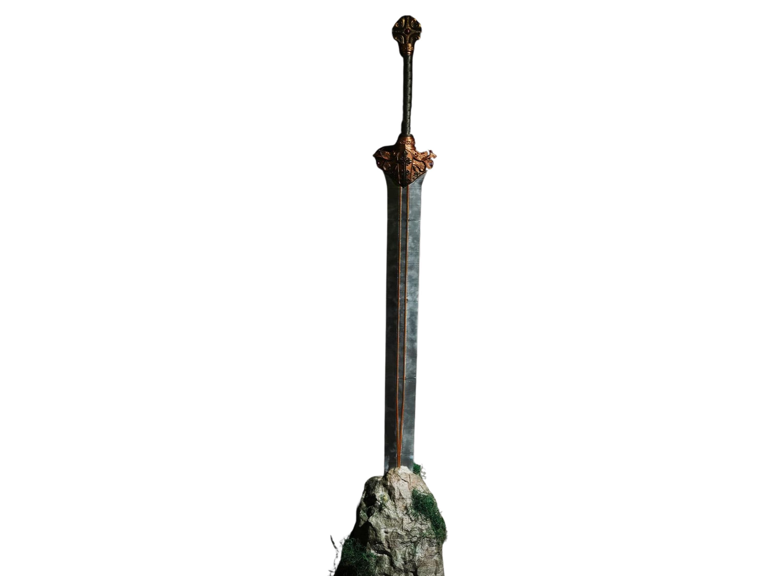34-inch fantasy-inspired decorative sword, 3D printed in PETG and hand-painted with an antique metallic finish. Non-functional replica ideal for home décor, collectors, cosplay displays and themed rooms. • Premium Hand-Painted Finish 🎨 Each Longsword is individually painted by hand, bringing depth, metallic tones, and a realistic medieval aesthetic ideal for display. • Large 34-Inch Presence ⚔️ Designed at approximately 86 cm, this long sword creates a striking visual impact for collectors, themed rooms, studios, gaming setups, and home décor. • Durable PETG Construction 💪 3D printed in PETG for enhanced strength and longevity, making it perfect for indoor decoration, shelf display, cosplay photoshoots, and prop collections. • Decorative, Non-Functional Replica 🔒 Safe for display use only — no sharp edges, no cutting ability, and not intended as a weapon or toy. Ideal for fans of medieval, fantasy, and mythic worlds. • Crafted by Skilled Artists 🛠️ Designed by Vinicius Mota and hand-painted by Thomas Padilha, resulting in an artisanal finish that makes every piece unique.