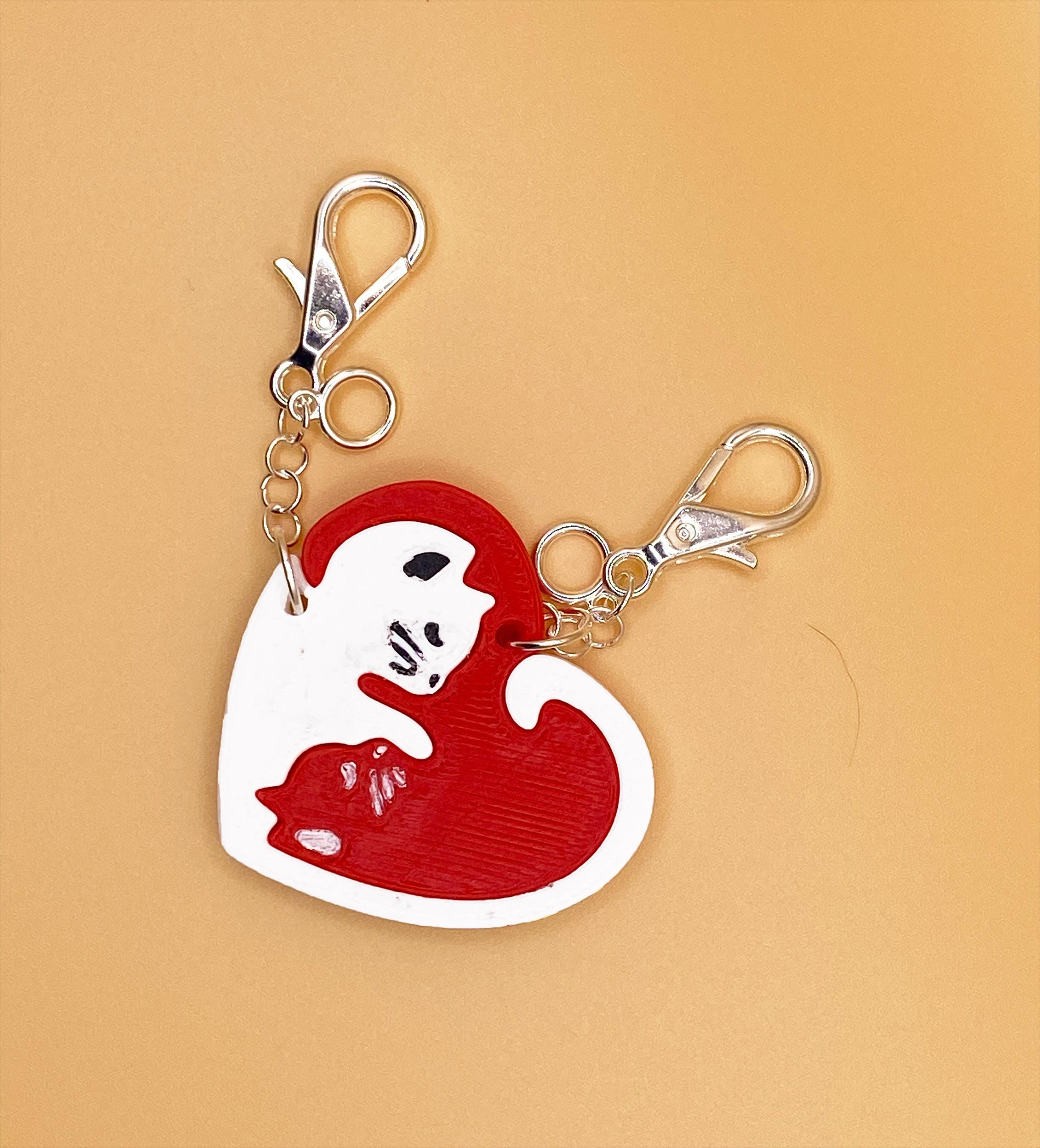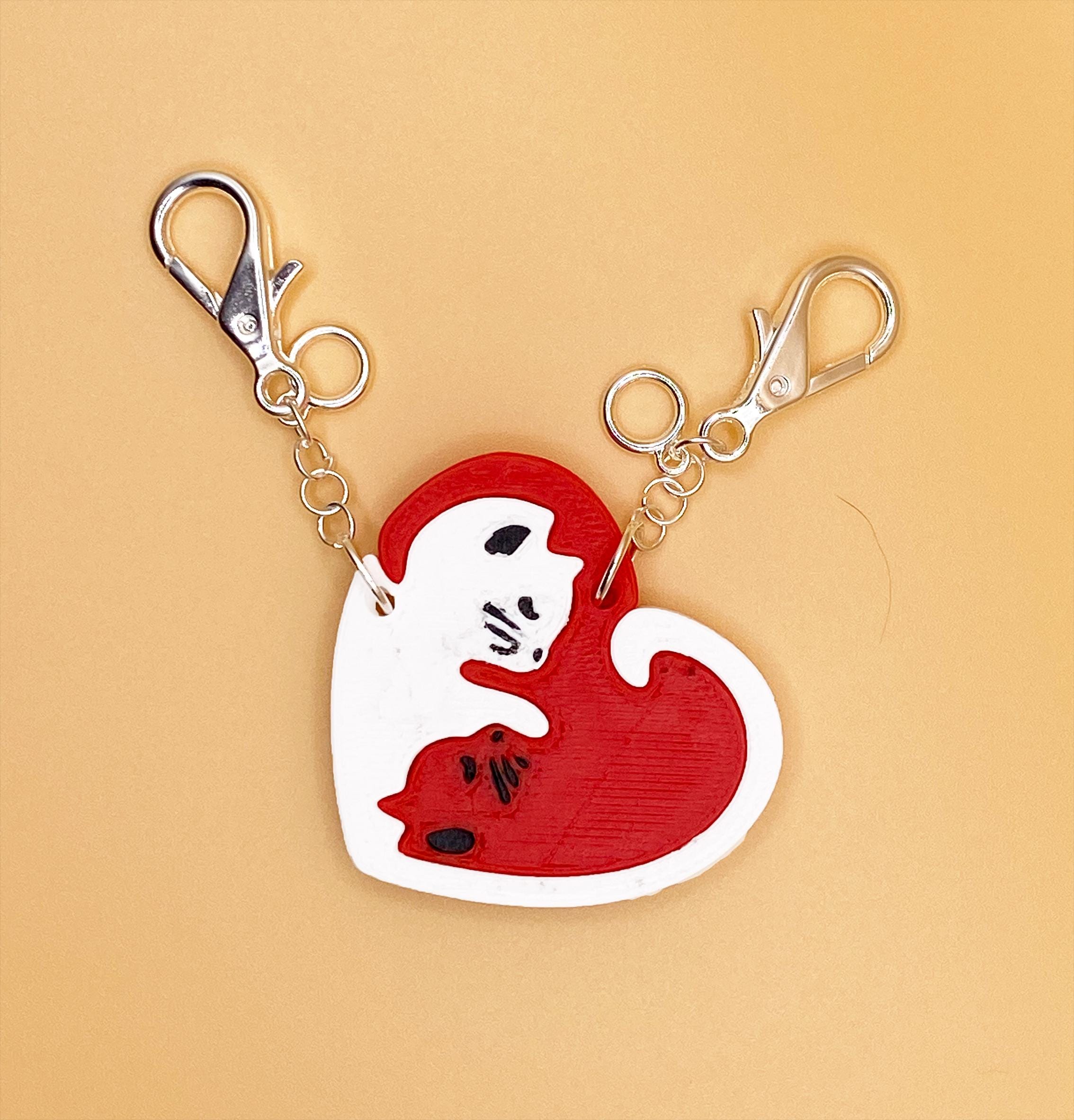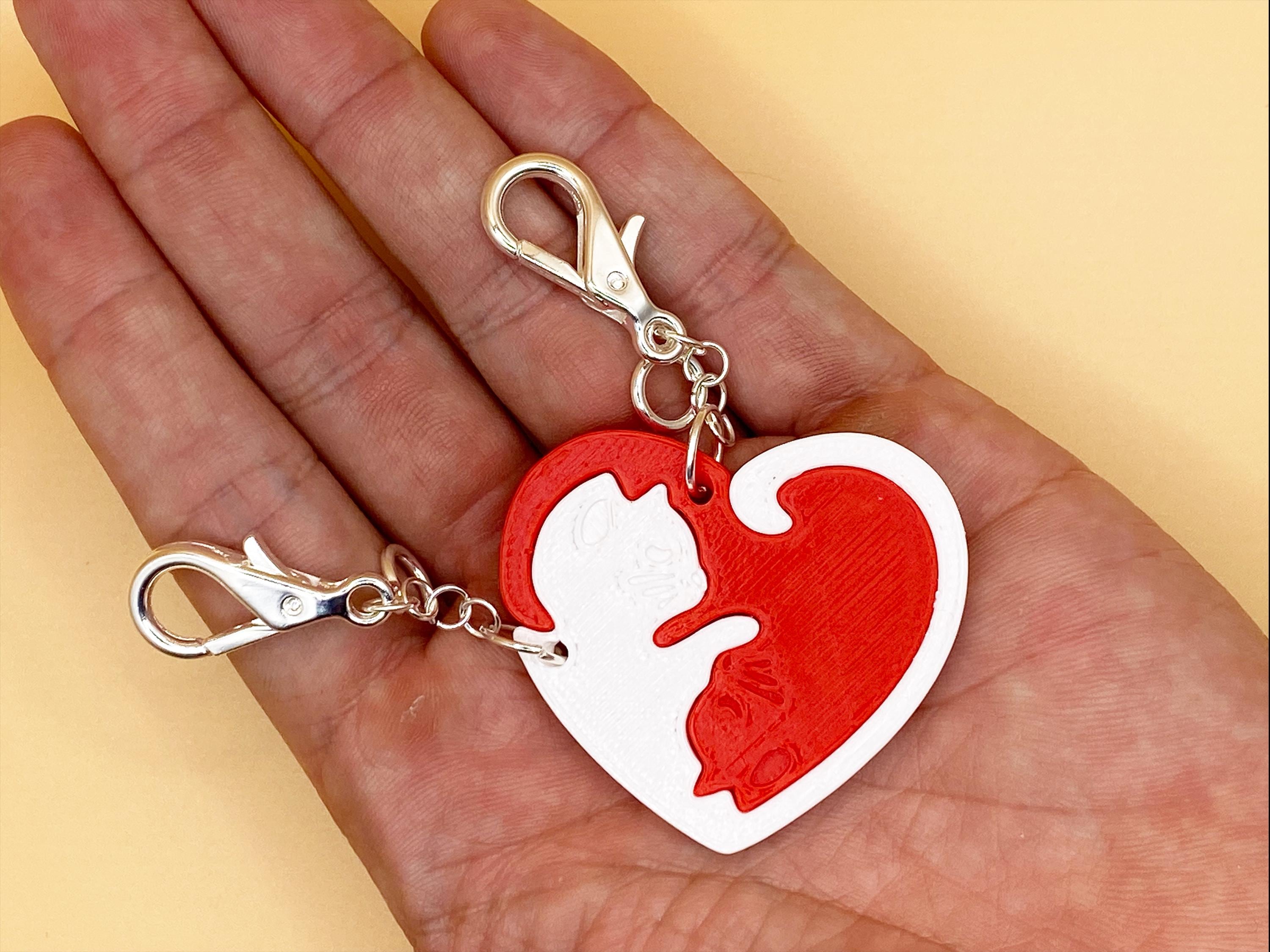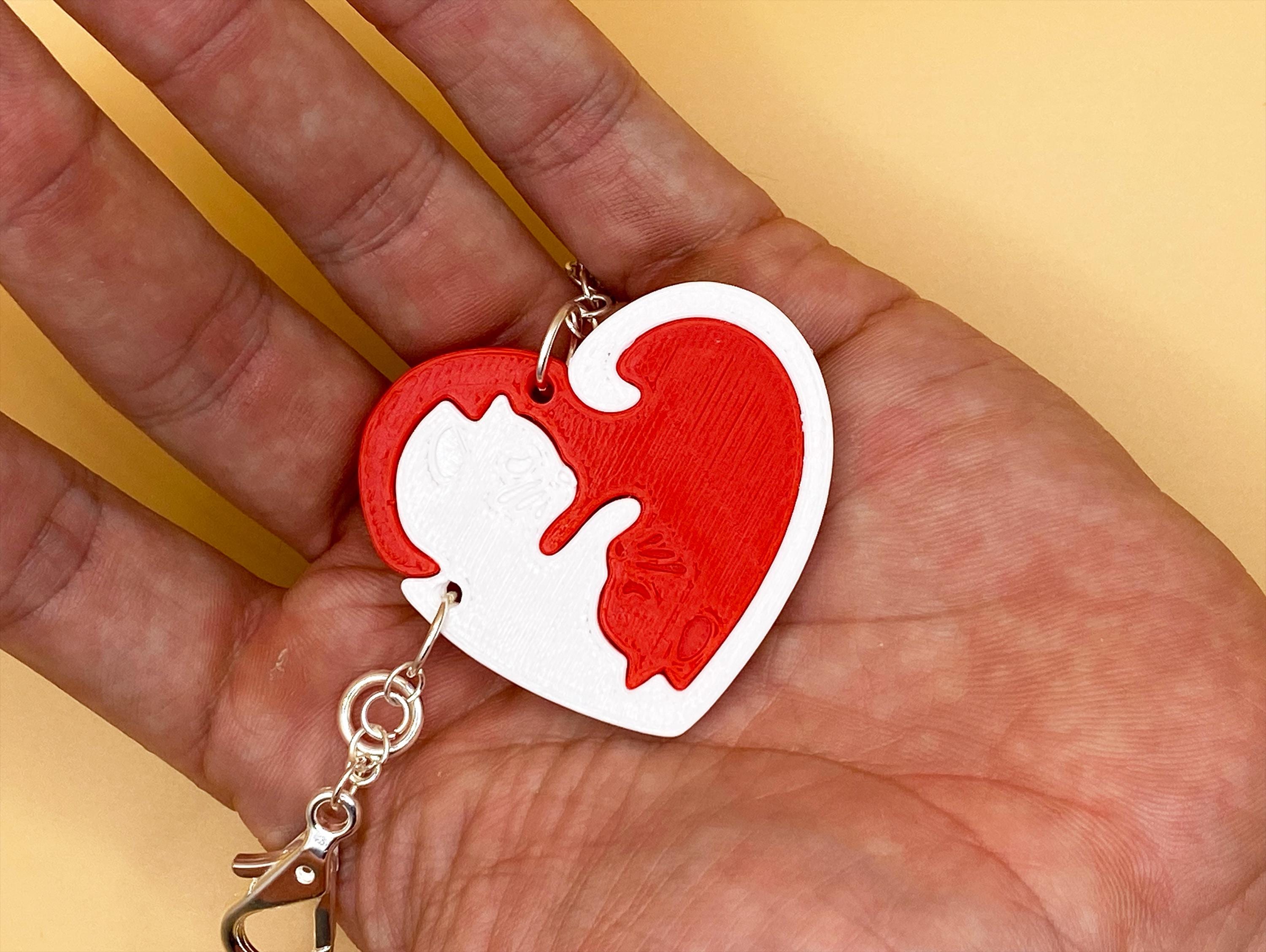 Celebrate your love with this adorable 3D-printed cat keychain set! 🐾 Perfect for couples, this heart-shaped keychain features two cats forming a loving embrace—one red and one white—symbolizing connection and affection. 🖐️ Handmade from durable PETG plastic 🎁 Ideal gift for Valentine's Day, anniversaries, or just because 🐱 Unique design for cat lovers and romantic souls 🔗 Each set includes two separate keychains that form a heart when placed together 🎨 Color: Red & White (Unpainted), with gold or silver chain depending on variation This charming keychain is lightweight and perfect for backpacks, keys, or bags. Surprise your partner with a gift that says "I love you" in the most purr-fect way.